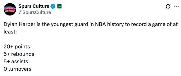 据统计,哈珀成为了历史最年轻单场至少拿到20分5篮板5助攻且0失误的后卫,只有19岁239天。